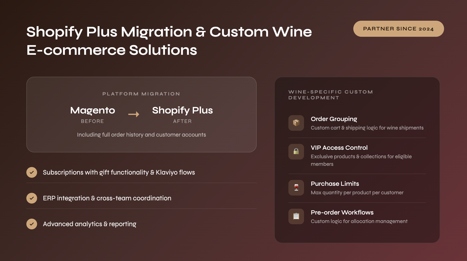 Chais d'œuvre, a premium French wine club offering rare wines and private sales to collectors and enthusiasts, needed to migrate from Magento to Shopify Plus. The wine industry presents unique e-commerce challenges: order consolidation for efficient shipping, purchase limits on allocated bottles, VIP access controls for exclusive wines, and complex pre-order workflows — none of which are natively supported by Shopify.