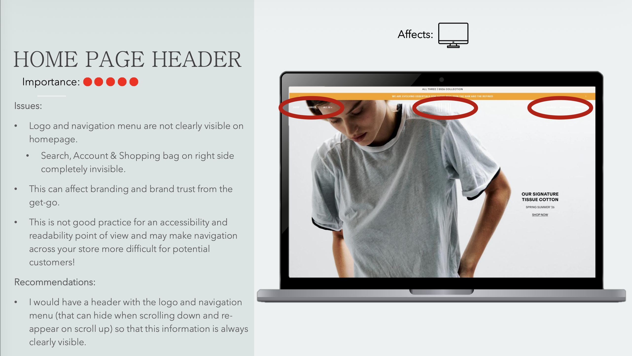 If your Shopify / e-commerce store gets traffic but you feel there's room for improvement, I will audit your store and identify what may be hurting sales or the overall customer experience.