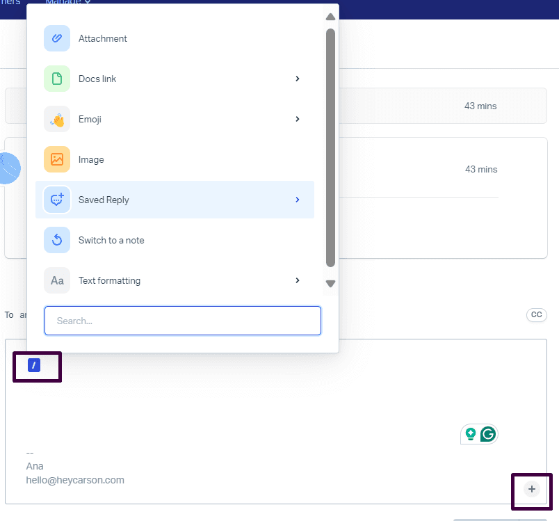 If the Reply option is selected, you may type out the response fully or use one of our saved replies. To browse the replies, type ‘/’ into the text box or press on the small + sign in the corner - a menu with more options will be revealed.